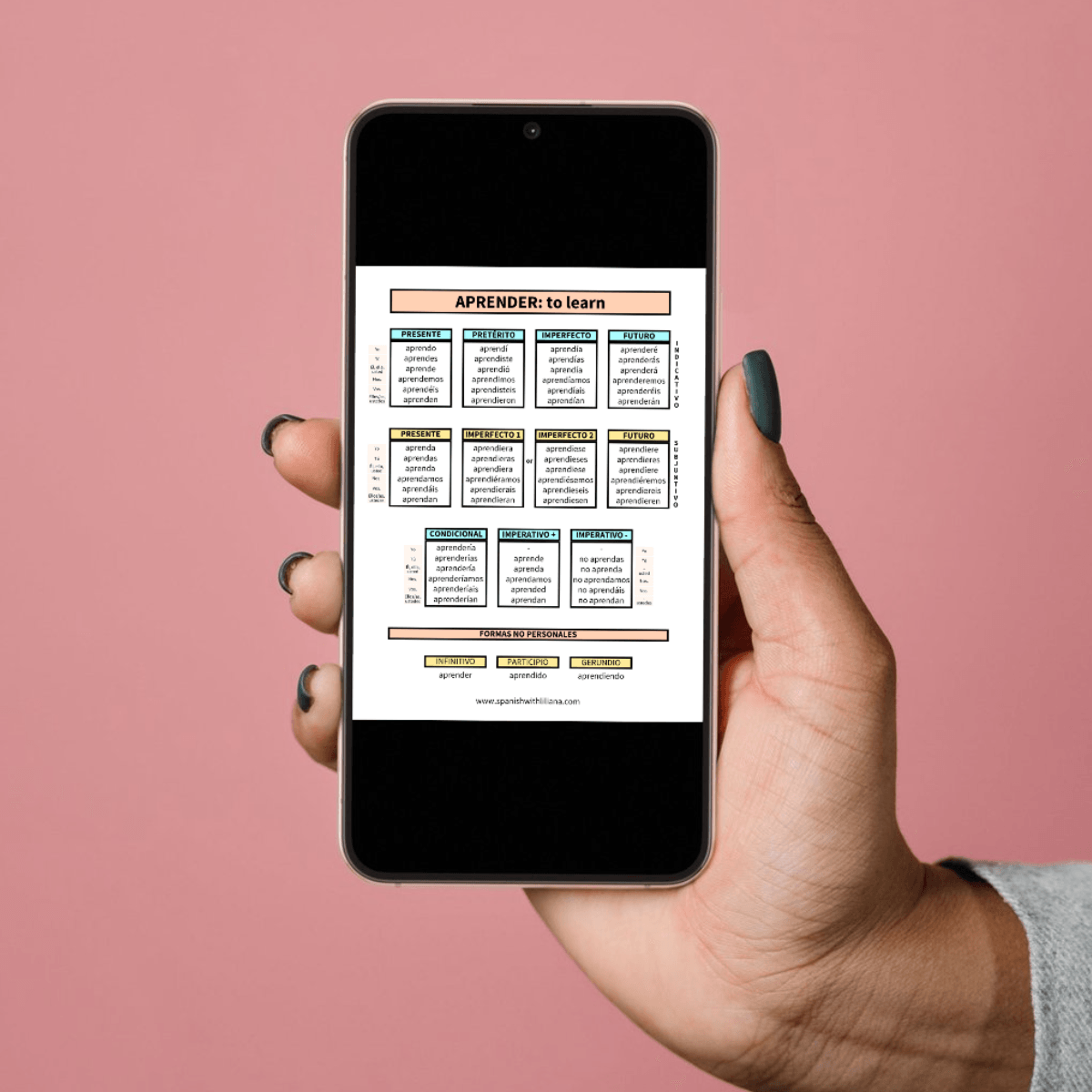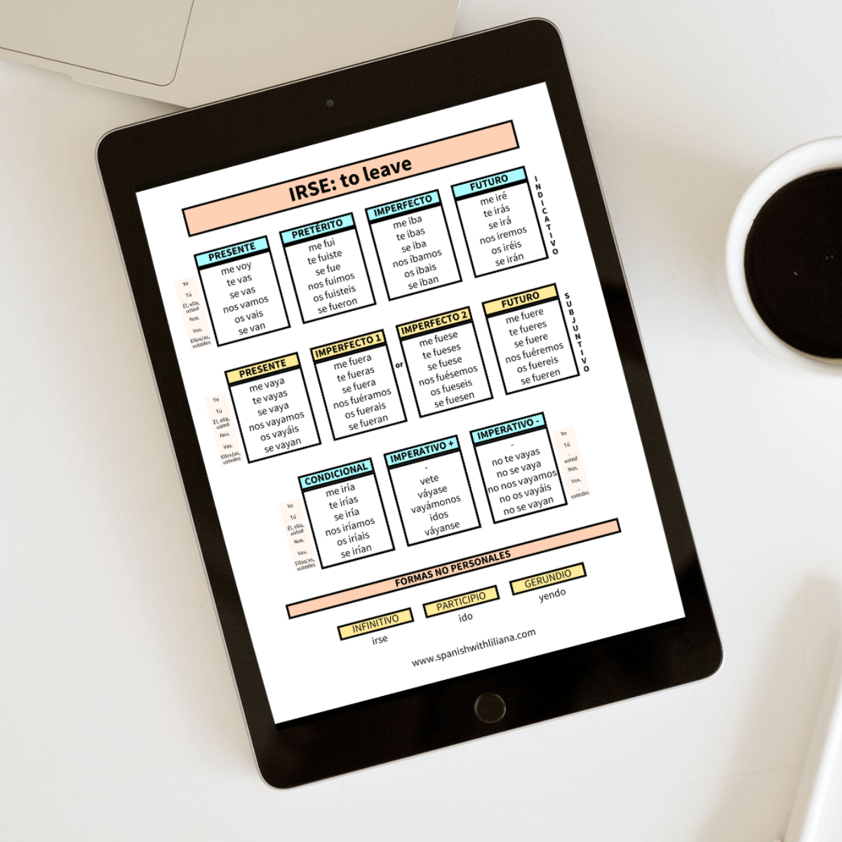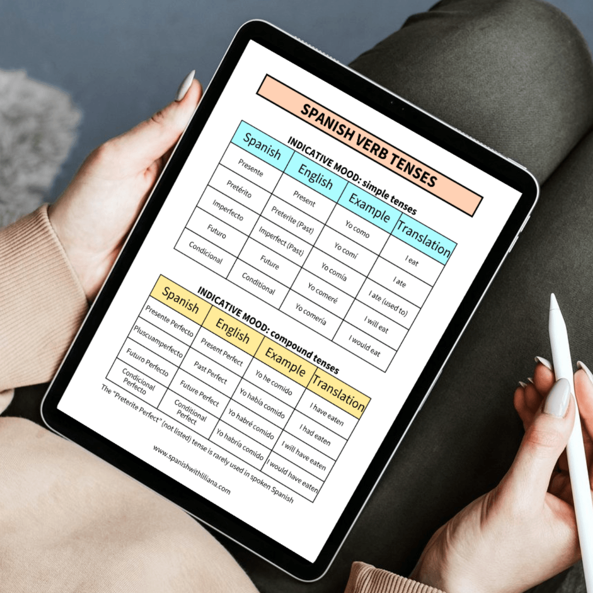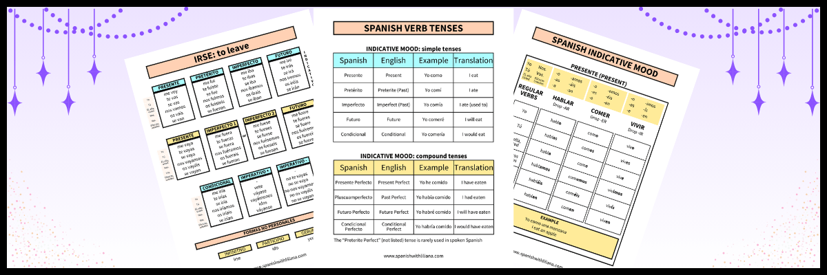 This set includes 10 PDFs covering all Spanish verb tenses, conjugations for regular verbs, compound tenses, and simple tense conjugations for over 300 verbs.